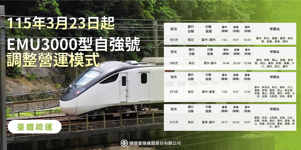 台鐵公司今宣布,為提供台中=高雄、屏東等都會區旅客便捷運輸服務,自3月23日起增加班次並調整營運模式,台中=潮州間191次、196次EMU3000型自強號調整為每日行駛,並調整191次停靠站。另南迴線台中=台東間371次及372