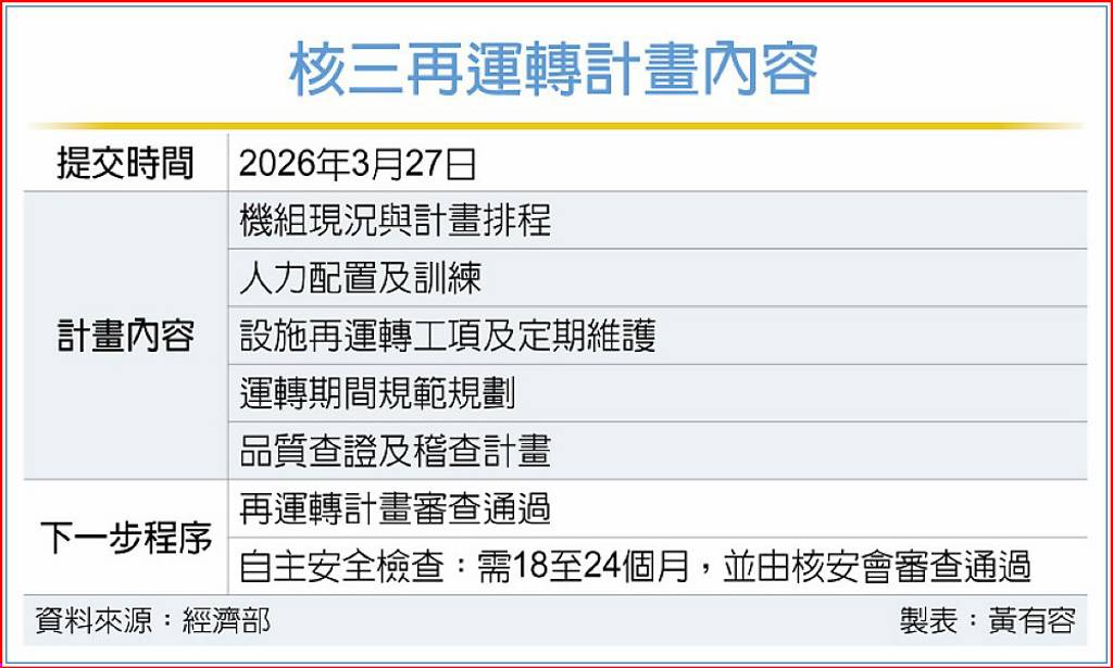 賴總統日前拋出評估重啟核二、核三,核安會證實,今(27)日收到台電提出核三廠運轉執照換照的申請,將依程序進行審查作業。