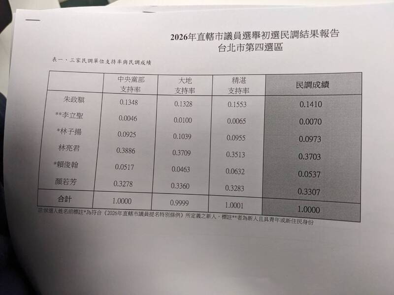 2026九合一選戰將在11月28日登場,各黨除加速縣市長提名作業外,各地「小雞」議員初選也相當激烈,備受關注首都台北市選情,民進黨台北市長人選遲未定案,但台北市議員第4選區(中山、大同)「6搶4」初選結果率先出爐,由現任議員林亮君、顏若芳、新人朱政麒、林子揚出線。值得注意的是,在民進黨內擁有高聲量的立委王世堅,其子弟兵賴俊翰落馬,也被視為是另類的「堅偉大戰」......