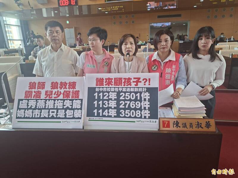 台中市2024年發生某國小棒球隊是狼教練事件,民進黨多位市議員擔心這兩年性平通報案增加,代表校園性平問題也增加,市議員陳淑華更表示,去年狼教練爆發之際,她要求盧秀燕向受害學生及家長道歉,盧秀燕不肯,但辣椒水事件,盧市府則向柯陣營道歉令人心寒。副市長鄭照新則表示,對狼教練事件他非常痛心,不管發生幾件,應徹底把原因進行檢討,並且要禁絕事件再發生;教育局長蔣偉民表示,絕對不允許在學校之中,有任何小朋友身體、心靈造成傷害,也對此事表達最大遺憾及歉意。