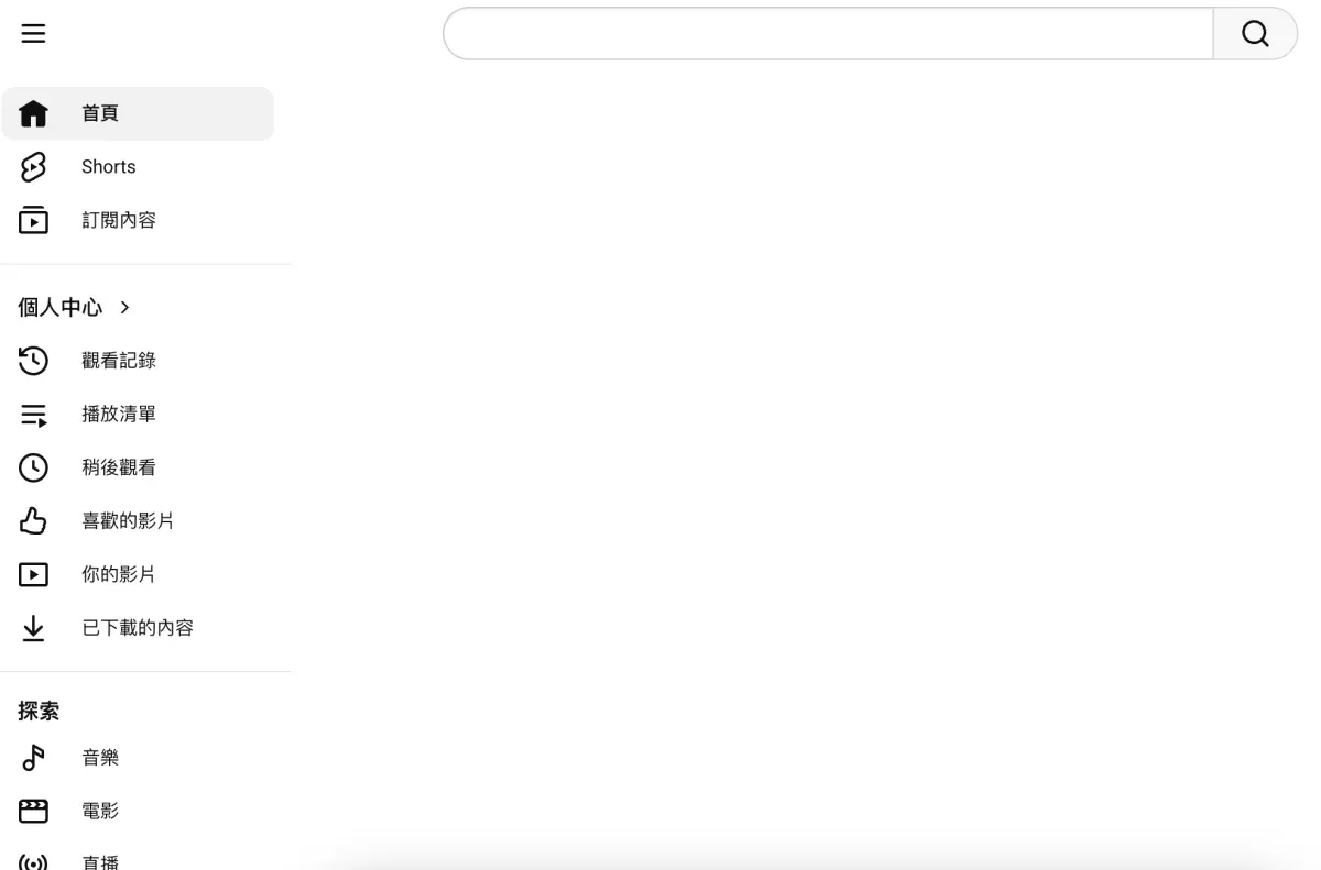 影音平台YouTube疑似出現異常狀況,打開網站後畫面僅剩側邊選單與上方搜尋列,中間主要內容區塊卻呈現一片空白,無法顯示任何影片或推薦內容,目前尚未確認是否為區域性或全球性異常,故障原因仍待進一步確認。