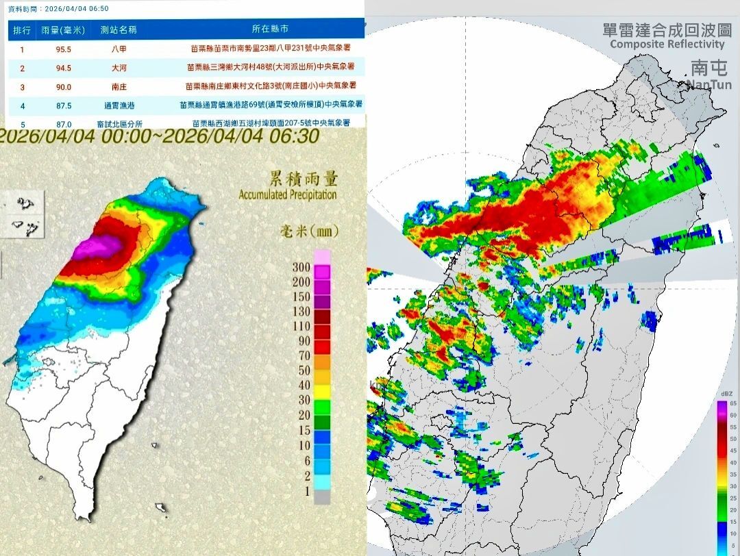 苗栗今(4)日遭猛烈雨勢狂轟,短短不到7小時就降下超過300毫米雨量,部分地區時雨量甚至突破100毫米,讓氣象粉專都直呼「蠻嚴重的!這種降雨會造成災情」。粉專也表示,短短不到7小時已降下超過300毫米的極端降雨,「以往比較常出現在梅雨或西南氣流等環境,在春雨鋒面的背景下是不太常見的。」