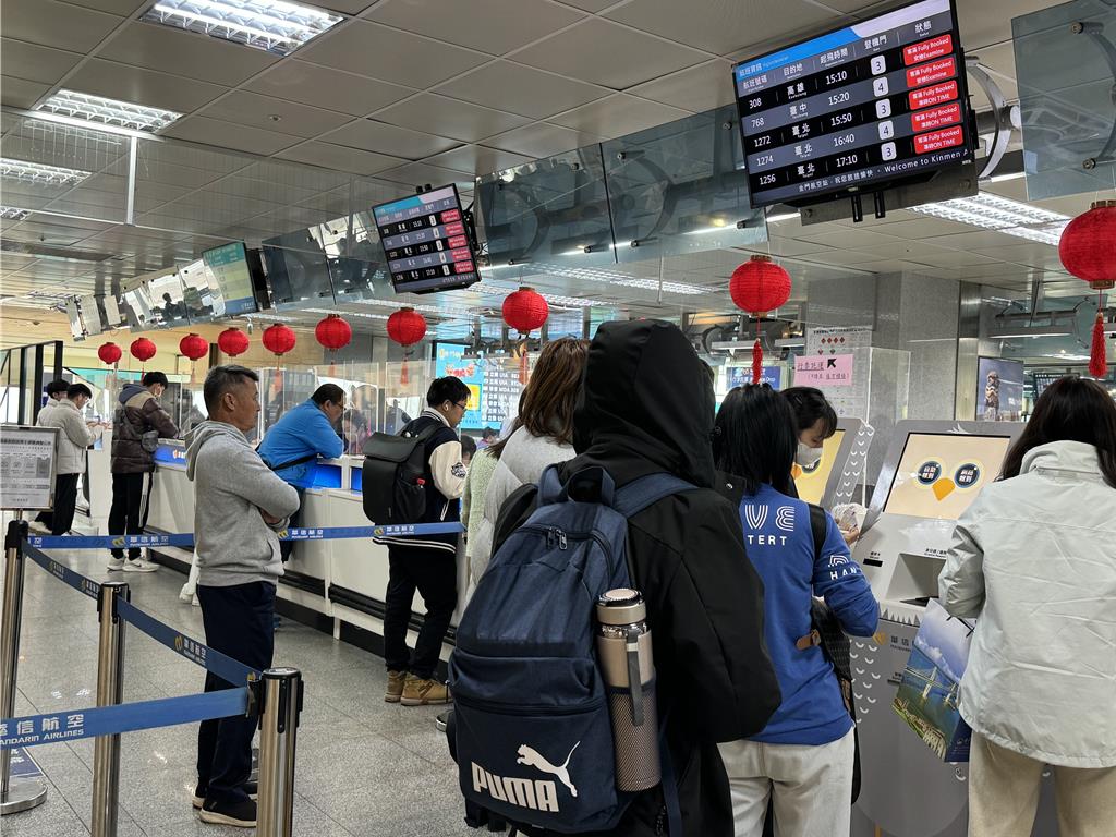 春節9天年假最後1天,金門尚義機場湧入返台人潮,縣府協調補助立榮、華信航空加開2架次客機,國防部第3趟軍機也在晚間10點由金門起飛,今天共增往返900多座位數協助旅客返台。金門縣長陳福海、縣籍國民黨立委陳玉珍罕見同框,「雙陳」同台出現機場安撫旅客情緒,引起鄉親側目。旅客趕著返台開工,金門機場一早就有人提早機場大廳「聯合補位服務櫃台」守候,好不容易開櫃,旅客報到率高,候補機位如鳳毛麟角,隨即額滿;許多候補旅客穿得一身喜氣,因不耐久候,早已盡顯疲態。