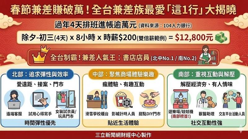 「春節兼職潮」強勢登場!104人力銀行最新報告指出,全台雙倍薪職缺逼近2萬個,春節期間(除夕至初三)排班4天,可輕鬆賺進逾萬元。調查揭示,最受歡迎的「書店店員」橫掃北中南奪冠。各地區兼職偏好也大不同:北部首選遠距彈性工作,如線上家教、遠端客服;中部則熱衷大型商場的「體驗經濟」,如滑雪學校、影城計時人員;南部則由「解壓經濟」主導,娃娃機遊樂場、交友平台活動人員等服務型職務最夯。這波春節兼職熱不僅提供高薪機會,更反映台灣各地獨特的打工文化與求職趨勢。