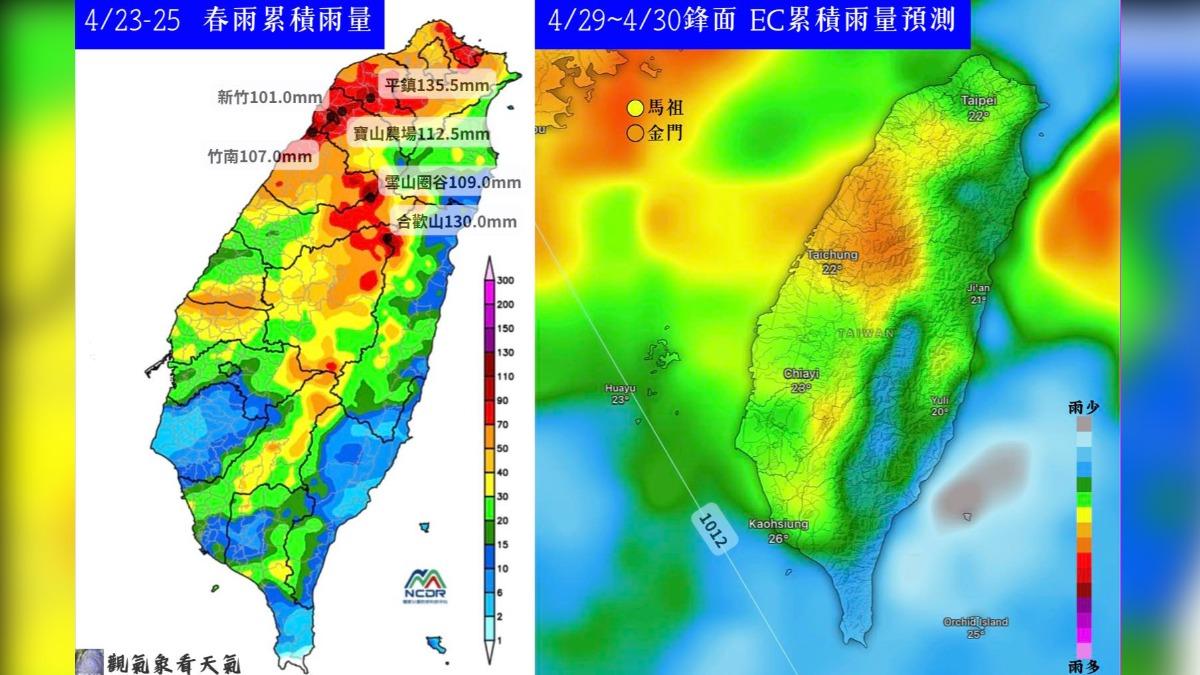 今(26)天白天起水氣明顯減少,各地大多為多雲到晴,根據臉書粉專「觀氣象看天氣」指出,前一波鋒面以桃園平鎮累積雨量最多達到135.5毫米,而竹苗平地測站也有累積破百毫米雨量,預計下一波鋒面大概周三到達。