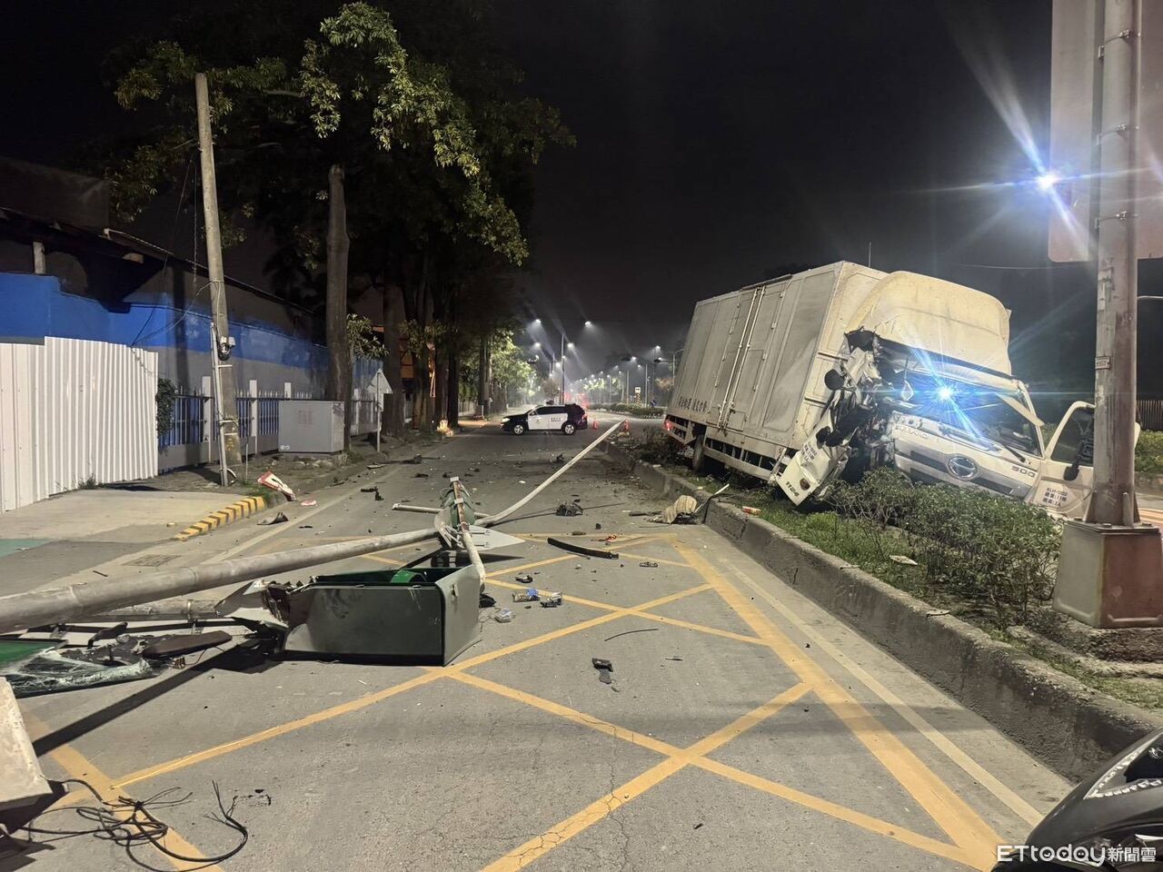 高雄驚悚車禍!今(13)日凌晨一輛小貨車行駛再高楠公路時,疑駕駛精神不濟猛撞分隔島,不僅車頭撞到變形,貨車騎上分隔島後,還把電燈桿、號誌控制箱撞翻噴飛在路中,現場零件散落一地,相當嚇人。警方表示,駕駛未酒駕,詳細肇責尚待進一步分析研判。