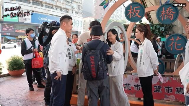 民眾黨主席黃國昌「母雞帶小雞」上午陪同黨內的議員參選人陳世軒、林子宇、陳語倢、陳怡君,前往新北市板橋花市與民眾拜票。