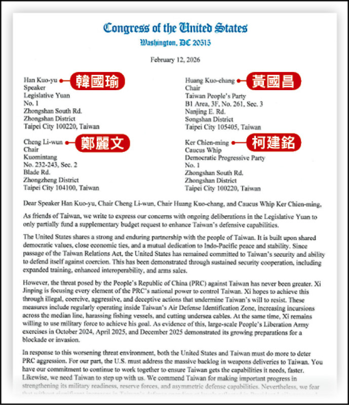 中國持續增加對台軍事威脅之際,行政院為期8年、規模1.25兆元的國防特別條例持續被國民黨和民眾黨在立法院封殺,引起美國華府多位大老級人物嚴重關切,甚至還向立法院發出公開信。政治評論員吳靜怡表示:「華府跨黨派34人聯盟公開警告,藍白立委再擋軍購就是向世界宣告台灣『不想自保』、替北京拖時間!」吳靜怡在臉