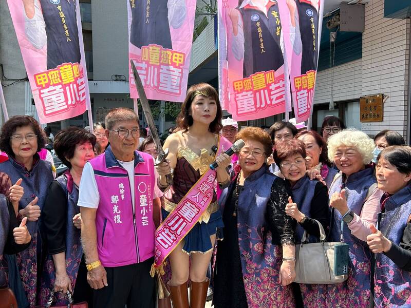 國民黨台南市長提名人謝龍介的愛將童小芸,今天化身「神力女超人」,手持「正義之劍」,在大批支持者的簇擁下,前往國民黨台南市黨部登記參選北區、中西區市議員選舉,誓言要幫國民黨贏回北區、中西區失去的那一席。童小芸強調,未來無論大小事,都會用「有事來找我」的態度面對市民,不管大小事,只要民眾願意找她,就會處理,神力女超人不只是造型,而是一種態度。
