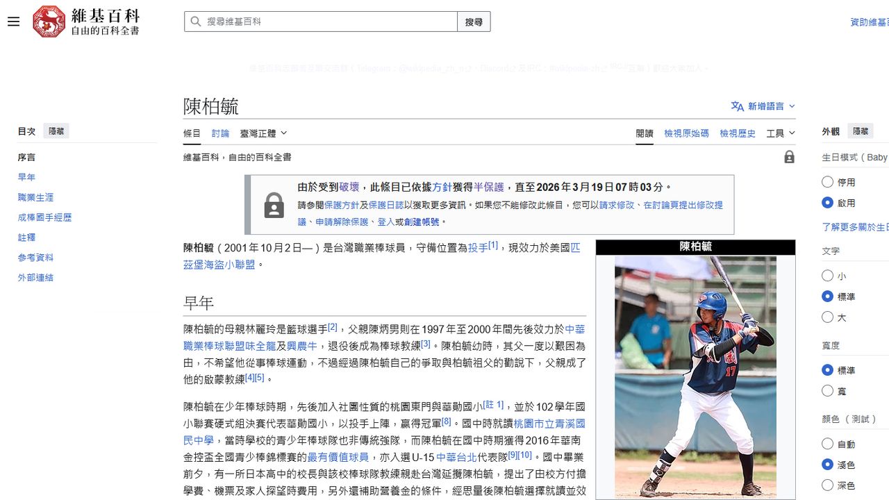 【劉育良/綜合報導】世界棒球經典賽(WBC)開打,台灣隊在日本東京巨蛋首戰以0:3敗給澳洲隊,想不到投手陳柏毓因為被澳洲擊出2分打點全壘打,竟然遭到酸民修改維基百科內容等方式攻擊,令球迷不捨地表示「超沒品的」。