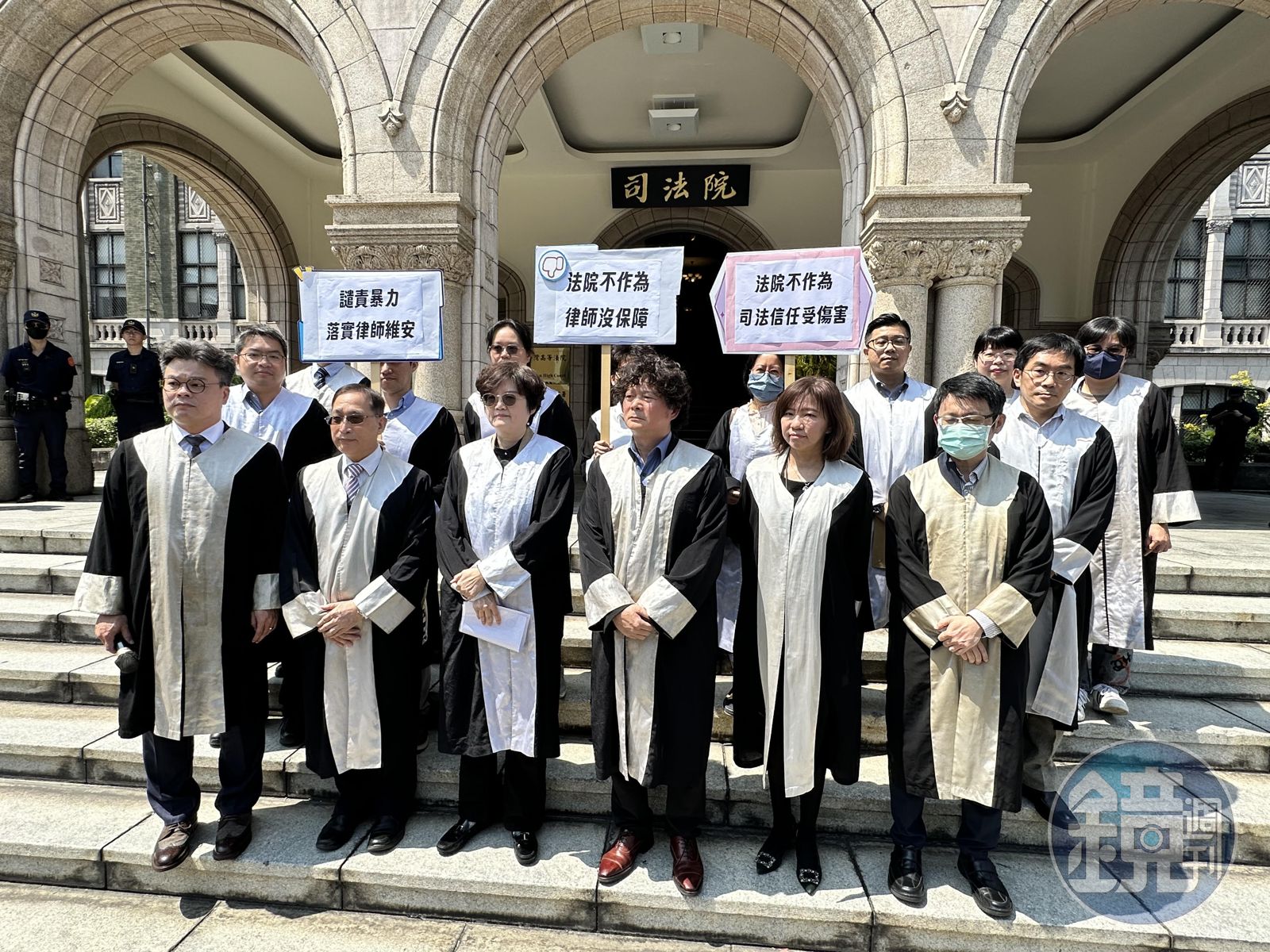 台中地院昨(17日)發生被告在法院內打律師巴掌事件,遭打的是台中律師公會理事長吳中和,他今在全國律師聯合會理事長李玲玲、副理事長蔡順雄、祕書長林俊宏與房彥輝等律師陪同下,至司法院前舉行記者會籲司法院要重視此案,吳中和指出,打人的林姓女子原本因恐嚇律師被起訴,上個月開庭時,即當庭嗆要殺律師,昨天則打他一巴掌,林女有再犯之...