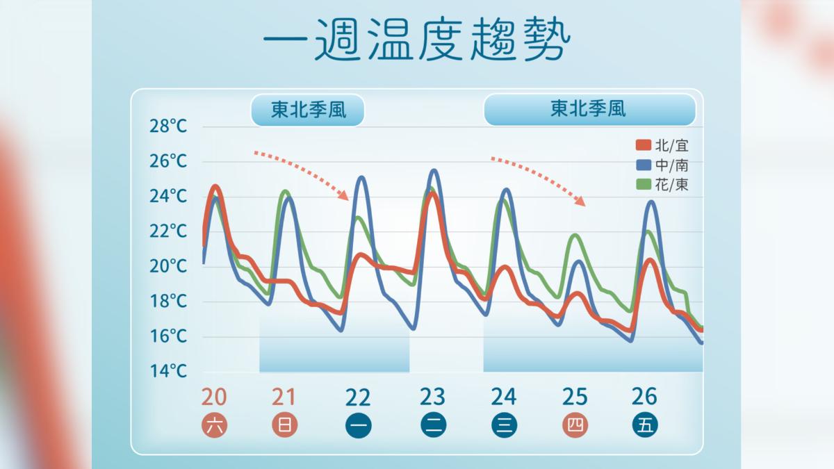 南方雲系影響全台,中央氣象署指出,今天多雲時陰並有短暫陣雨,尤其北台灣降雨機率高,晚間東北季風增強,降雨機率再度提升,高溫23至25度、低溫17至19度。明天「冬至」,北台灣氣溫轉涼,基隆北海岸及大台北降雨明顯,週一至週五東北季風持續影響,提醒民眾注意天氣變化及路面安全!