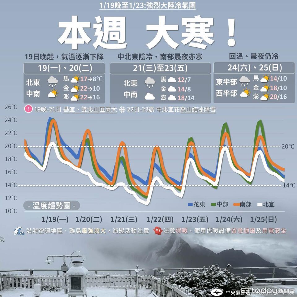 今(20)日強烈大陸冷氣團南下,氣象專家賈新興指出,最低溫出現於明(21)日深夜至週四(22)清晨,台北氣象站有出現11.2至11.8度低溫的機率;竹苗以南空曠區域,則有出現6至8度低溫的機率。