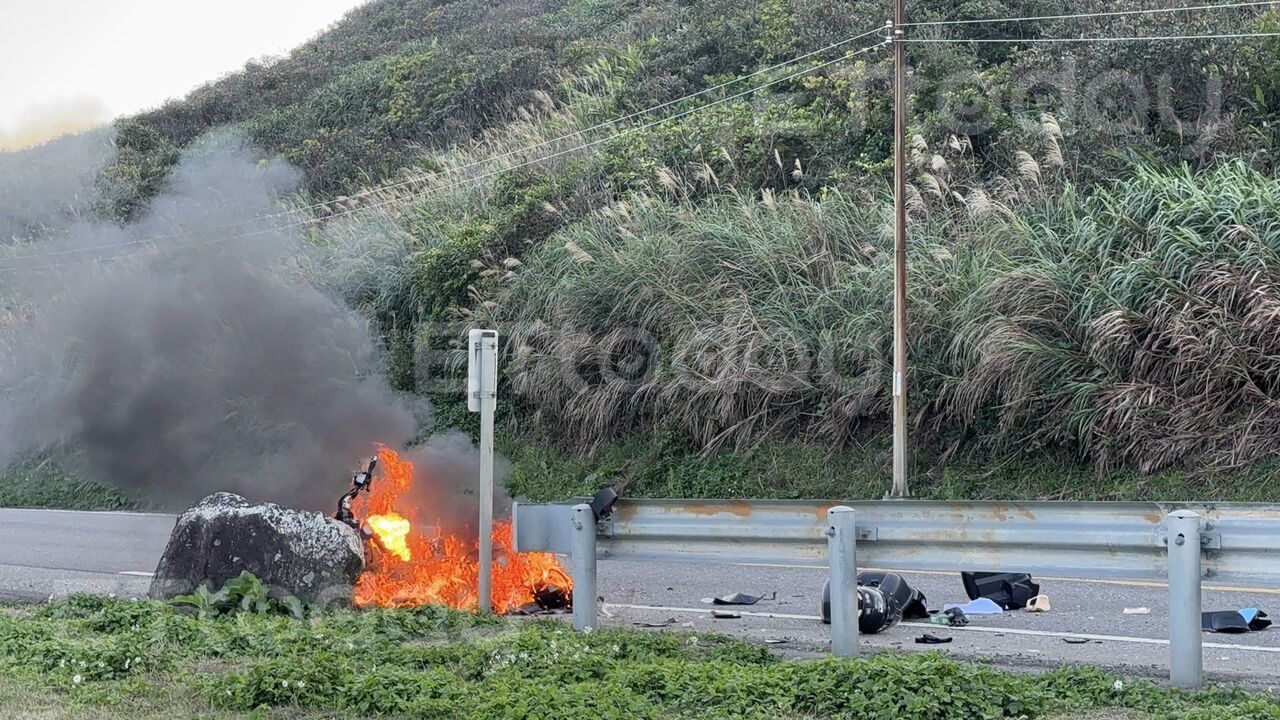 55歲何姓機車騎士今日下午4時27分騎車載著林姓女友人行經新北市貢寮區馬崗街附近時,突然自撞護欄。兩人跌落路面後,機車突然起火燃燒,冒出大火。新北市消防局獲報後,立刻派員趕往現場搶救,30分鐘將火勢撲滅。救護人員抵達時發現林姓女子疑似腳骨折,何男手、腳挫傷,緊急將女子送往醫院救治,事故原因則待進一步釐清。新北市瑞芳警分局獲報後,派遣福隆卯澳所及澳底車禍處理小組共4名警力到場處理,警戒指揮管制交通,初步調查何男騎車不慎自撞護欄,機車倒地之後起火燃燒。