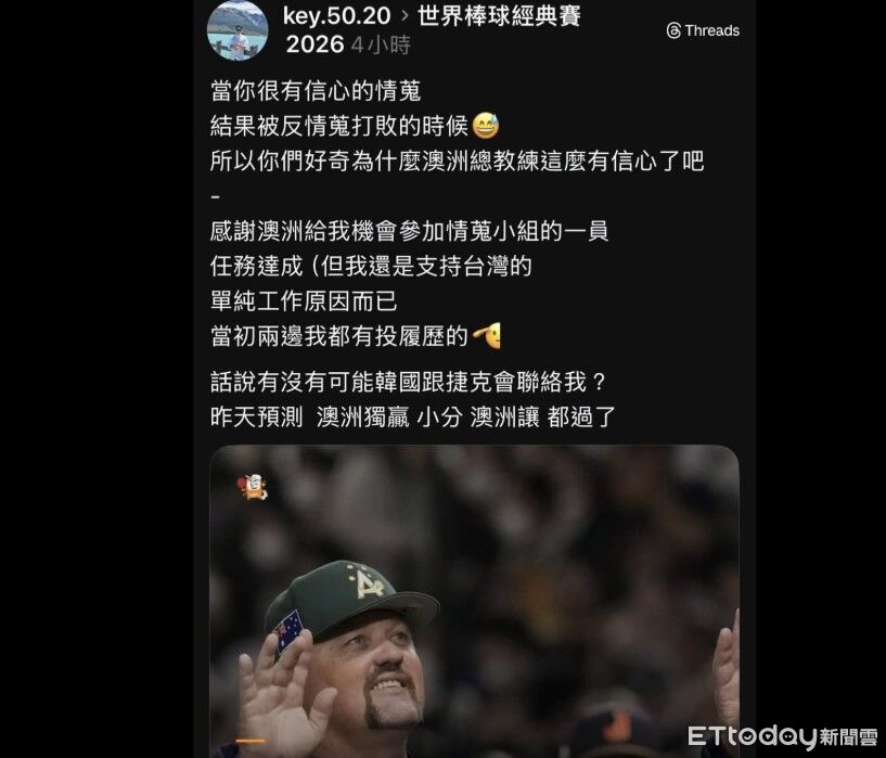 2026年經典賽台灣隊首戰出師不利,主將陳傑憲受傷更讓球迷心情沉重。不料,一名自稱台灣人的網友「陳柏豪」在Threads上大放厥詞,自誇協助澳洲隊情蒐並冷嘲熱諷,且還自介上寫「中區國稅局主任秘書」,慘遭網友熱搜,但中區國稅局今(6)日緊急澄清表示,機關內並無此人,該名男子也未在國稅局任職過。