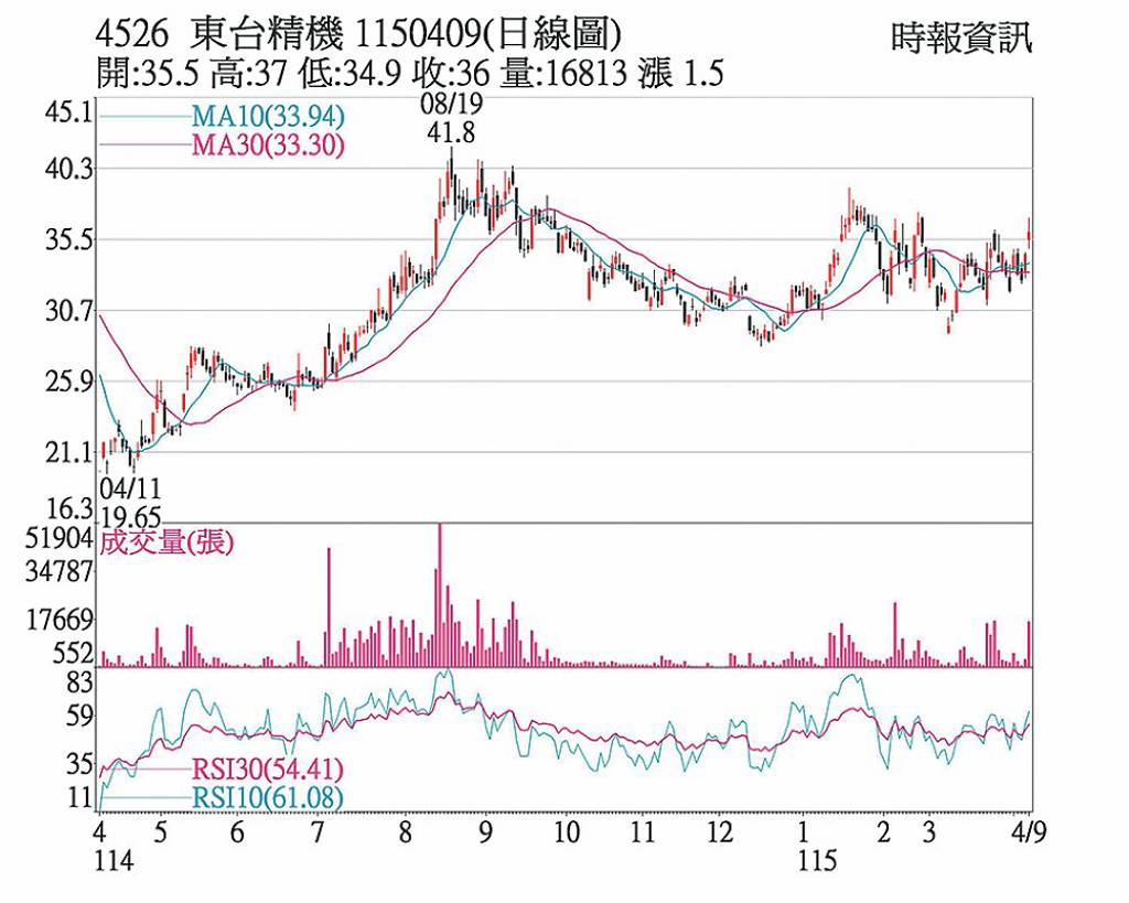 東台(4526)3月底參加台灣國際工具機展,首度推跨平台串聯能力的「AI代理人」,市場認為具AI題材。遭外資9日由買轉賣1,703張,自營商買進82張,市場追價買盤湧現,成交爆大量,推升股價上漲1.50元而以36.0元收盤,突破所有技術線型反壓。 在手訂單約23億元,第二、三季出貨可望優於同期。著手...