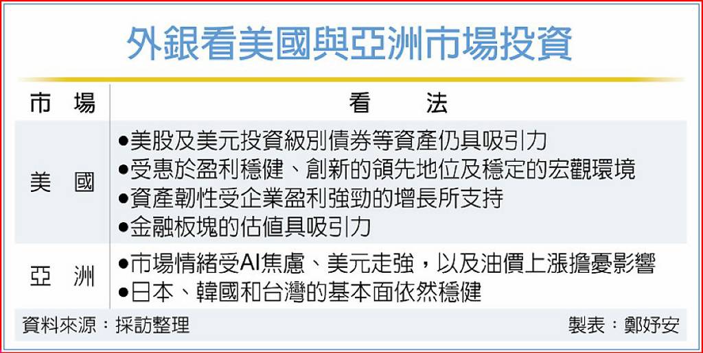 美國聯準會降息循環、川普關稅政策影響,及AI投資浪潮等,被視為美元資產前景的關鍵變數。不過,外銀指出,盈利穩健、創新的領先地位及相對穩定的宏觀環境等三因素顯示,美國資產仍具吸引力,同時認為出現停滯性通貨膨脹的風險仍然偏低,為降低集中風險,投資組合仍需在不同地區、行業及貨幣之間保持分散配置。 滙豐銀行...