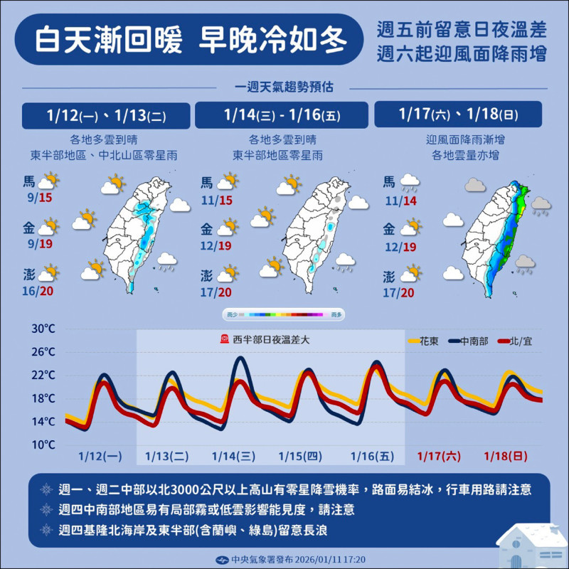 大陸冷氣團減弱,中央氣象署今(12日)下午4時許持續發布「低溫特報」,受冷氣團加上輻射冷卻影響,新北市、桃園市、新竹縣3縣市仍有清晨10度以下氣溫發生機率,預估明天(13日)還有一波冷氣團南下,全台早晚偏冷,西半部日夜溫差大,北部、宜蘭低溫下探12度以下,中部以北3000公尺以上高山並有零星降雪可能。