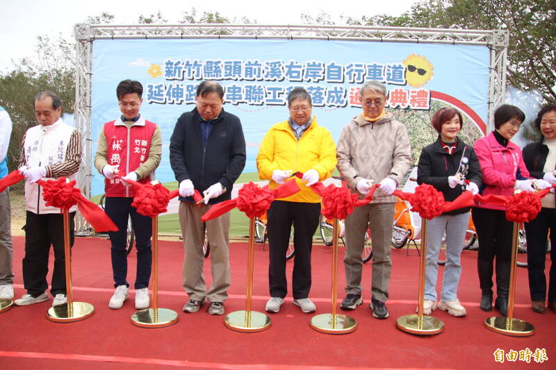 新竹縣頭前溪右岸自行車道今天正式通車,縣長楊文科、第二河川分署長楊人傑、以及公路局北區養護工程分局長謝俊雄等特別選在全線最有看點的「銀合隧道」一起剪綵,再由楊文科領軍踩踏YouBike率先上路。因為這條短短900公尺的自行車小秘「徑」,成了啟動新竹縣從關西經芎林到竹北隘口後,循頭前溪右岸一路西行轉銜豆子埔溪、鳳山溪,向北可經新豐、桃園直攻雙北,往南則可暢行新竹市17公里海岸線的關鍵鑰匙,使這條自行車道成為暢遊北台西部最新的「鐵腿」路徑。楊文科說,這個工程全長約23公里多,在公路局北區養護工程分局、水利署第2河川分署支持下,歷時8個月完成,總工程款5156萬元。車道西起自鳳山溪旁的竹北水月意象景觀橋,經豆子埔溪來到頭前溪大橋北岸的加油站後方,轉騎行到橋下,透過新竹市頭前溪左岸自行車道轉換回到新竹縣的頭前溪右岸,在竹北隘口的越堤引道導入銀合隧道後向東進入芎林,再經115號縣道抵達新埔寶石大橋,銜接上關新田園自行車道後暢遊關西。