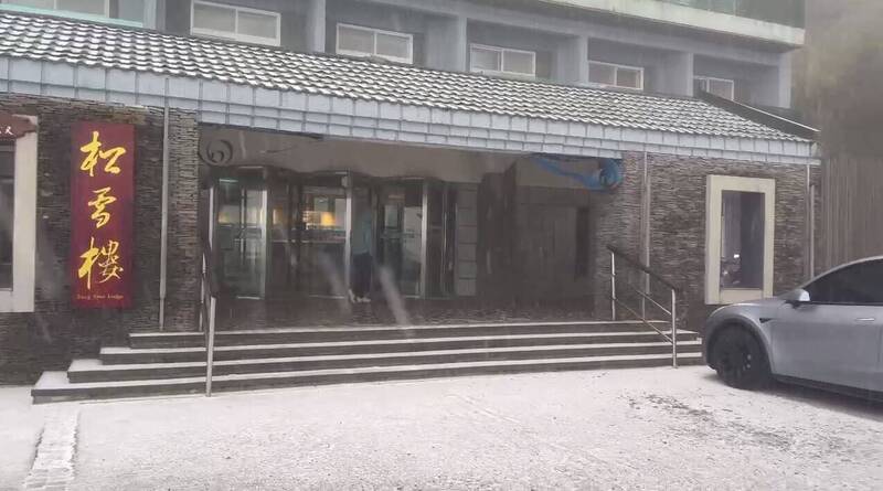 南投仁愛鄉台14甲線合歡山公路,昨晨濕冷突下冰霰,公路、建物「如覆糖霜」,追雪族驚喜不已,公路局除限加掛雪鏈通行,傍晚翠峰至大禹嶺路段更預警性封路,以維護行車安全。(記者劉濱銓)