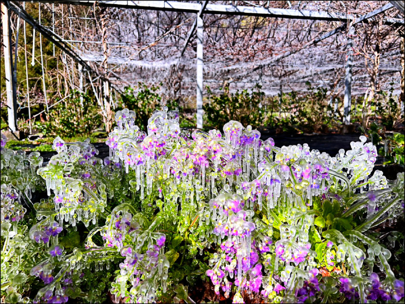 春天乍暖還寒,台中市武陵農場昨日清晨低溫僅零下1度,園區為保護灌溉系統不被凍裂而啟動的灑水措施,意外與低溫「共舞」,將藤花園雕琢成一座晶瑩剔透的水晶宮殿,垂櫻枝條、花苞跟櫻草花花瓣也被凍成冰晶,一早巡園的工作人員忍不住直呼,彷彿動畫電影「冰雪奇緣」的艾莎公主施展魔法。