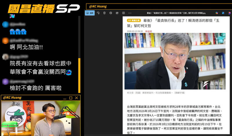 京華城案3/26一審即將宣判,民眾黨創黨主席柯文哲就說,不懂為何法院不敢法庭直播,應該讓全民來公審他啊,柯文哲還分享,現在黨內開創「政治獻金課」,以自身為戒,要所有參選人都來上課。