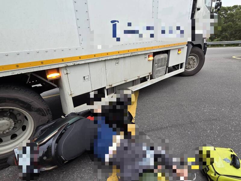 苗栗縣竹南鎮公義路與香山交流道南下路口今天(2日)下午發生嚴重車禍,59歲林姓婦人騎機車與貨車發生碰撞,連人帶車捲入車底。苗栗縣消防局出動3車8人趕赴現場救援。消防人員到現場發現,林婦受困貨車車底,無法動彈,傷勢嚴重。搜救小組使用墊塊穩定車身,以葫蘆頂升工具爭取空間,救出林婦。