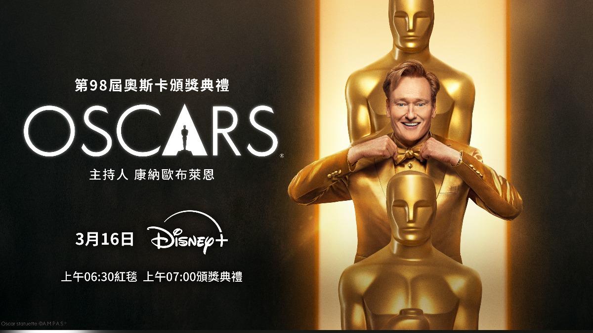 擔心今年第98屆奧斯卡頒獎典禮,沒電視頻道會轉播,現在解決辦法來了,Disney+今日正式宣布,奧斯卡金像獎®將於台灣時間3月16日上午6時30分起,在Disney+全台同步直播。今年連莊主持的依然是曾獲艾美獎肯定、身兼主持人、編劇、製作人及喜劇演員的康納歐布萊恩(Conan O’Brien)。