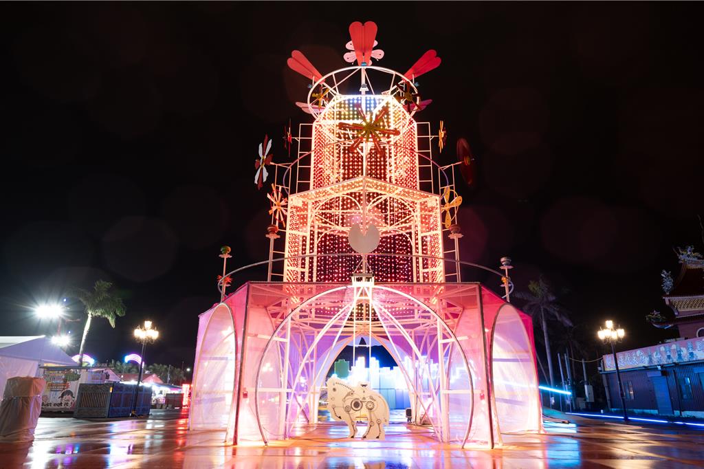 花蓮太平洋燈會今(7日)晚在市區東大門夜市旁日出大道開幕,今年以「花現騎蹟・光躍洄瀾」為主題,由藝術家鄭乘騏跨領域與建築藝術團隊合作,將現場打造為花蓮山海地景的大型戶外藝術場域,另外全縣13鄉鎮主要道路