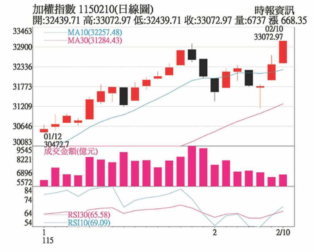 台指期夜盤9日深夜上演「暴力軋空」行情,指數狂飆260點,一舉突破32900大關。主要受日本眾議院大選結果底定、政治黑天鵝消散激勵,外資認錯回補台股。市場分析指出,避險資金轉向,鎖定與日本半導體供應鏈連動最深的台股進行報復性反彈。此外,主力無視封關賣壓,提前卡位年後「開紅盤」行情,顯示對台股挑戰33,000點以上歷史大關極度樂觀。建議投資人可轉趨積極,對於AI、半導體等趨勢向上族群考慮「抱股過年」,參與潛在的補漲紅包行情。