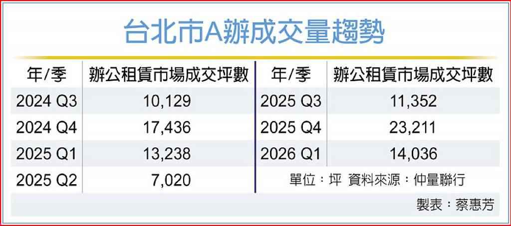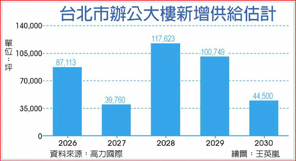 辦公大樓供給大潮來了!高力國際統計,未來五年台北市將有高達39萬坪新完工辦公室,海量灌進市場,第一波高峰會落在今年,約達8.7萬坪,約為過去十年年均新增供給量的2.5倍,去化速度恐難以同步,辦公室空置率預期將逐季上升,市場趨勢恐將從房東市場反轉進入「房客市場」。 高力國際1日發布「2026年第一季台...