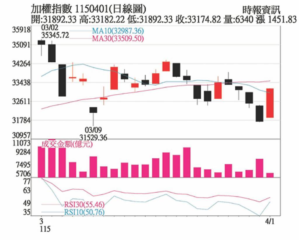 伊朗總統首度鬆口「願結束戰爭」,加上川普暗示戰事可能不會持續太久,美股四大指數大漲,台指期夜盤上漲千點,激勵台股加權指數1日大漲1,451點至33,174點,台指期上漲1,448點至33,402點,正價差略減至227.18點,顯示市場持續看好未來氛圍,帶動空方回補。 永豐期貨表示,在美國即將完成軍事...