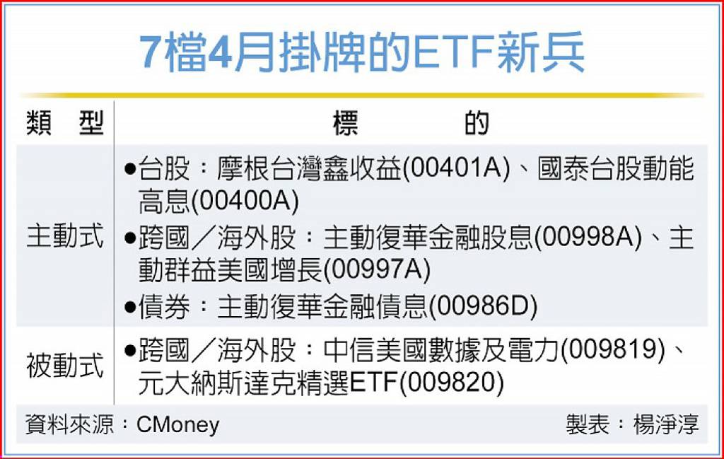 證券市場第一季迎來13檔ETF掛牌,大幅優於去年同期間的8檔,而4月即將有7檔新兵將掛牌,其中5檔都是主動式ETF,將再推升主動式ETF規模更上一層樓。 第一季掛牌的ETF中,規模突破百億元的有凱基台灣TOP50(009816)、主動安聯台灣(00993A),大華美國MAG7+(009815)也坐擁...