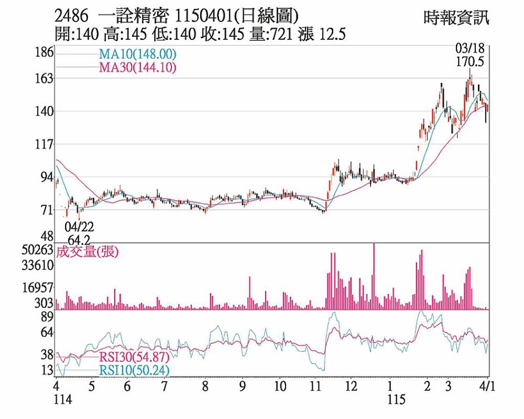 一詮(2486)雖被列入處置股票,1日仍受加權指數大漲逾千點激勵,股價緩步走高,終場勁揚9.43%,以145元作收,站回五日均線之上,目前日KD仍在低檔,一詮將在3日解禁。一詮統計,2024年散熱元件營收比重僅18.03%,2025年第三季攀升至26.83%,去年第四季開始更一路狂飆,9月之後已經突...