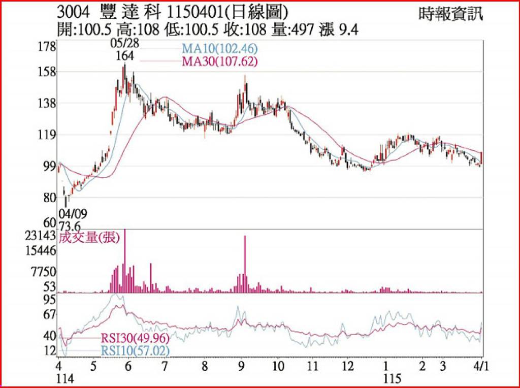 豐達科(3004)受惠航太產業復甦力道強勁,營運攀升,近期股價表現相對抗跌,在百元關卡附近形成支撐,1日亮燈漲停,股價收108.0元,成交量能溫和放大的趨勢明顯。觀察近期量能變化,隨營收成長趨勢明確,買盤承接意願轉強,日均成交量維持在一定水準,顯示市場籌碼趨於穩定,中長線投資價值浮現。 前二月營收7...
