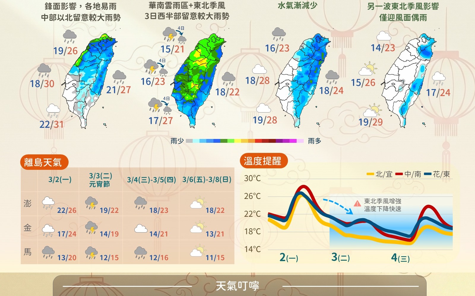 228 連假即將結束,但民眾最期待的元宵節(3月3日)天文奇景可能要讓大家失望了。根據中央氣象署最新預報,未來一周將有2波東北季風接力襲台,本周天氣屬於先濕後乾,周四前天氣都不穩定!兩波鋒面與多波東北季風交織,特別是 3 月 3 日元宵節當天,受鋒面及華南雲雨區東移影響,全台將陷入雷雨天氣,不僅氣溫顯著下滑至 15 度左右,原訂傍晚登場的「月全食(血月)」景......