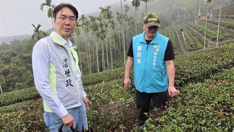 南投縣久旱導致茶樹不發芽,春茶恐減產3至5成,民進黨南投縣長參選人温世政,今會同農業部、南投縣議員陳玉鈴,以及南投縣政府等單位深入竹山、鹿谷茶區會勘農損,要爭取中央天然災害救助,縣府表示,春茶旱害恐是全縣性,將爭取農損補助納入全縣茶區,降低茶農損失。