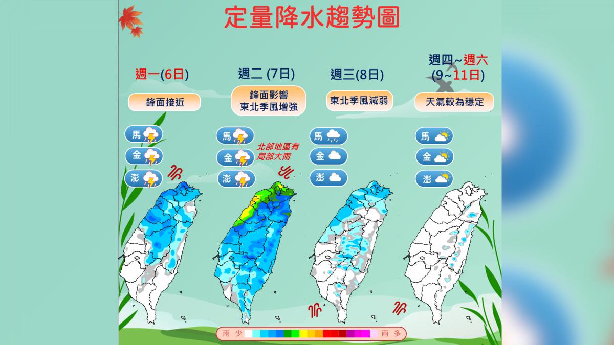 今(5)天鋒面結構逐漸變差,降雨趨緩,各地仍有局部短暫陣雨,南部地區還是有機會出現局部的雷雨,請多留意;隨著環境風場逐漸轉為偏南風,各地白天氣溫回升,新竹以北及宜花東高溫25到27度,苗栗以南約29、30度,至於各地低溫約18到21度。
