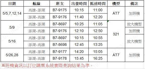澎湖觀光旺季隨著國際海上花火節即將升空,將正式揭開序幕,使得原本淡季就吃緊的空運交通,更令民眾擔憂。經過立委楊曜辦公室與澎湖縣政府旅遊處,積極向民航局及航空公司協調,端午節連假及5月加班機出爐,有需求民眾請盡快訂票。台澎端午連假管制機票,4月20日上午9時準時開放,澎湖航線(不含澎湖-金門)共提供704架次、58438座位數,後續將視訂位情形滾動增班。訂位方式請逕洽各航空公司或透過:APP、7-11 ibon、全家FamiPort購票。