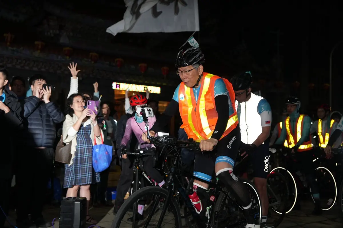 前民眾黨主席柯文哲、現任主席黃國昌28日挑戰騎單車1日北高,一路南下,下雨天候不佳,晚間約9時30分許抵達嘉義縣布袋大眾廟,比預定時間8時30分晚了約1小時,大批小草冒雨等候,見到柯文哲騎抵,熱情歡呼「加油」相