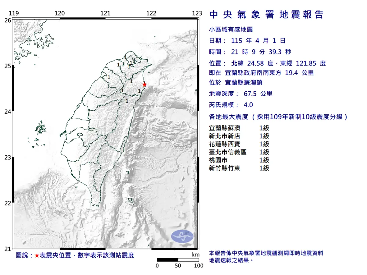 宜蘭縣蘇澳鎮今晚9點09分發生芮氏規模4.0小區域有感地震,最大震度1級。中央氣象署的資料顯示,這起地震震央位於宜蘭縣政府南南東方19.4公里,深度67.5公里。最大震度1級,包括宜蘭蘇澳、新北新店、花蓮西寶、台北信義區、桃園市及新竹縣竹東。