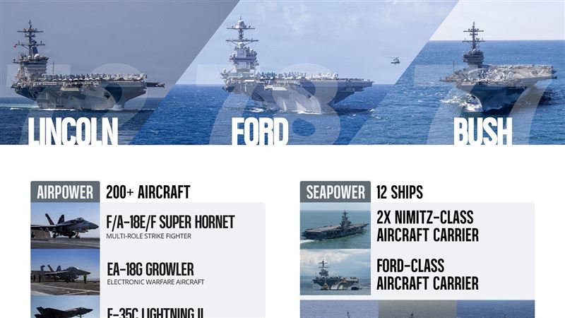 美國中央司令部廿三日在社媒X發文表示,美軍航空母艦「布希號」打擊群同日駛入位於該司令部轄區的印度洋。即伊朗附近已有至少廿七艘軍艦,包含三艘航艦:「林肯號」、「福特號」及「布希號」。