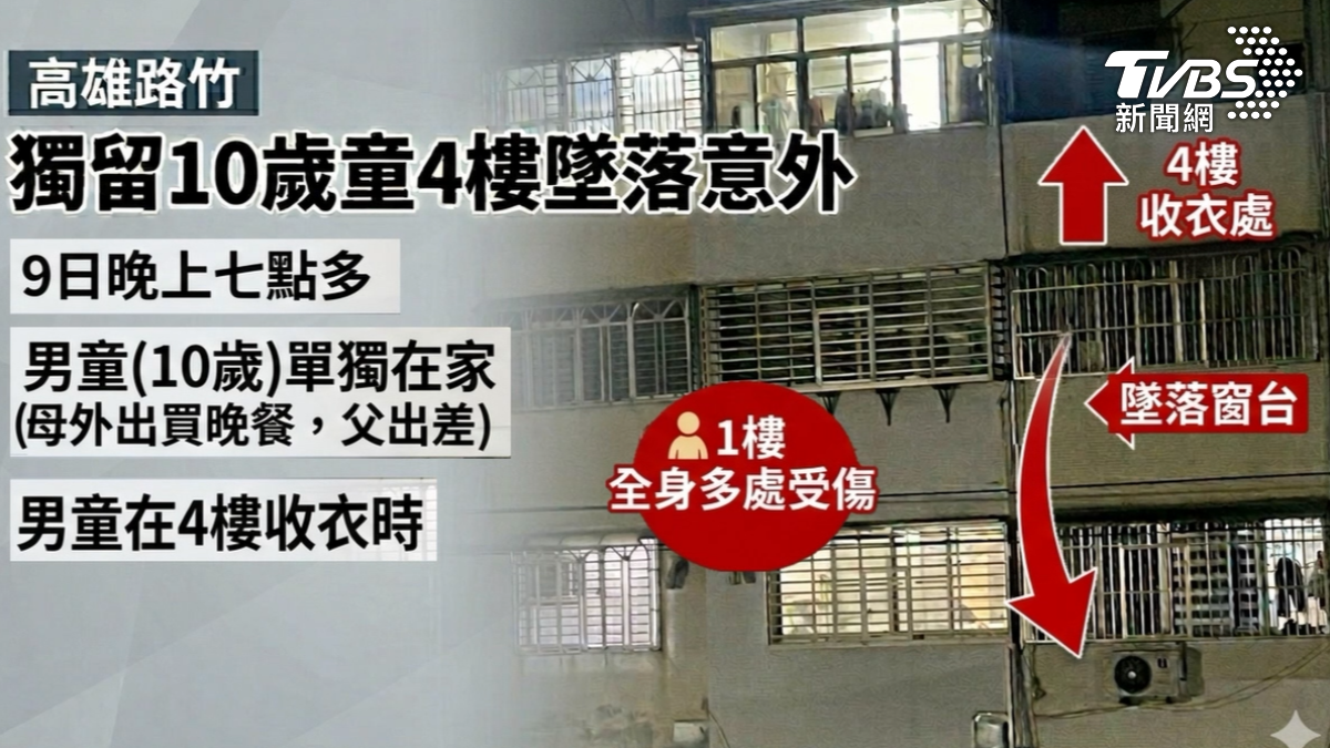 高雄市路竹區9日晚間驚傳男童墜樓意外!一名10歲男童疑似在4樓收衣服時,不明原因從窗台墜落,全身多處受傷,事發當時媽媽外出買晚餐、爸爸出差,男童獨自在家,所幸送醫後意識清楚,確切原因仍待警方調查。