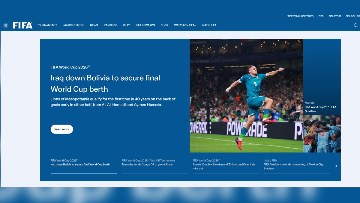 2026年4月1日,2026年國際足聯世界盃男子足球賽決賽圈的最後一個參賽席位正式揭曉,亞洲球隊 伊拉克國家隊 在洲際附加賽決賽中以 2比1 擊敗玻利維亞隊,成功搶下本屆世界盃的末班車,將與其他47支球隊一同挺進世足正賽。