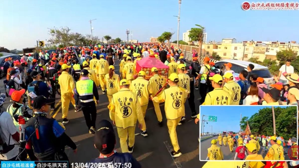 年度宗教盛事「白沙屯拱天宮媽祖進香」於今(13)日凌晨起駕,這次報名的信眾高達45萬多人,一路沿著苗栗通霄、苑裡前行。白沙屯媽祖今早則已沿著台1線進入台中市,估計有25萬名信徒同行,場面相當盛大。此外,白沙屯媽祖稍早約10時30分左右,衝進大甲區的文昌國小,許多小學生、國小教師立刻鑽轎底祈福。