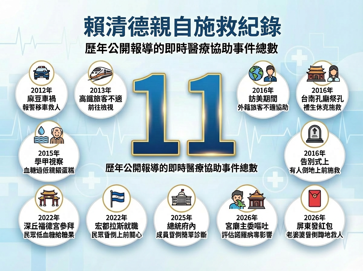 今天(18日)適逢大年初二,總統賴清德一早前往台南的台灣祀典武廟參香,武廟主委林培火因身體不適,突然摀住口鼻嘔吐,但仍噴濺到賴清德身上,嚇壞現場所有人,賴清德也馬上上前關心;接著賴清德到屏東發紅包,一名等總統福袋的老婆婆突然昏倒,他也「小跑步」衝上前看診。事實上,賴清德從政以來,「醫師魂」爆發已不罕見,彙整過去幾年的公開訊息,賴清德截至今天,至少已救11人。