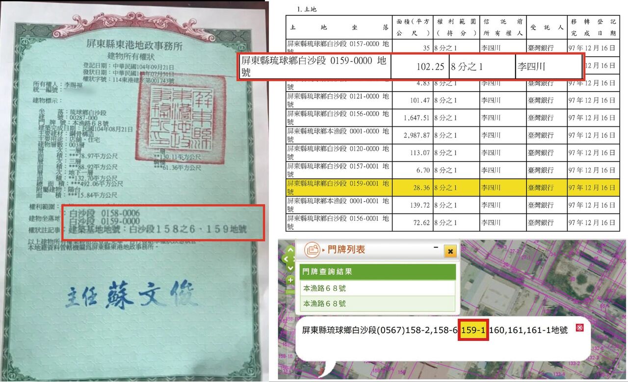 台北市副市長李四川過年前宣布將辭職參選新北市長,但隨即被爆出胞弟李賜福主導小琉球環保恐嚇犯罪集團。今(27日)又再被爆料,該公司地址位於李四川財產申報名下土地。對此,李四川今秀出胞弟權狀澄清,土地由家族成員共同持分,「而兆福環保公司並不在共同持分土地上」。而根據李四川出具權狀,李賜福建物地號為「白沙段158-6」、「白沙段159」,綠委王義川就發現,「白沙段159」同樣是李四川持分土地。網紅四叉貓也酸,拿出權狀這樣解釋有比較好嗎?
