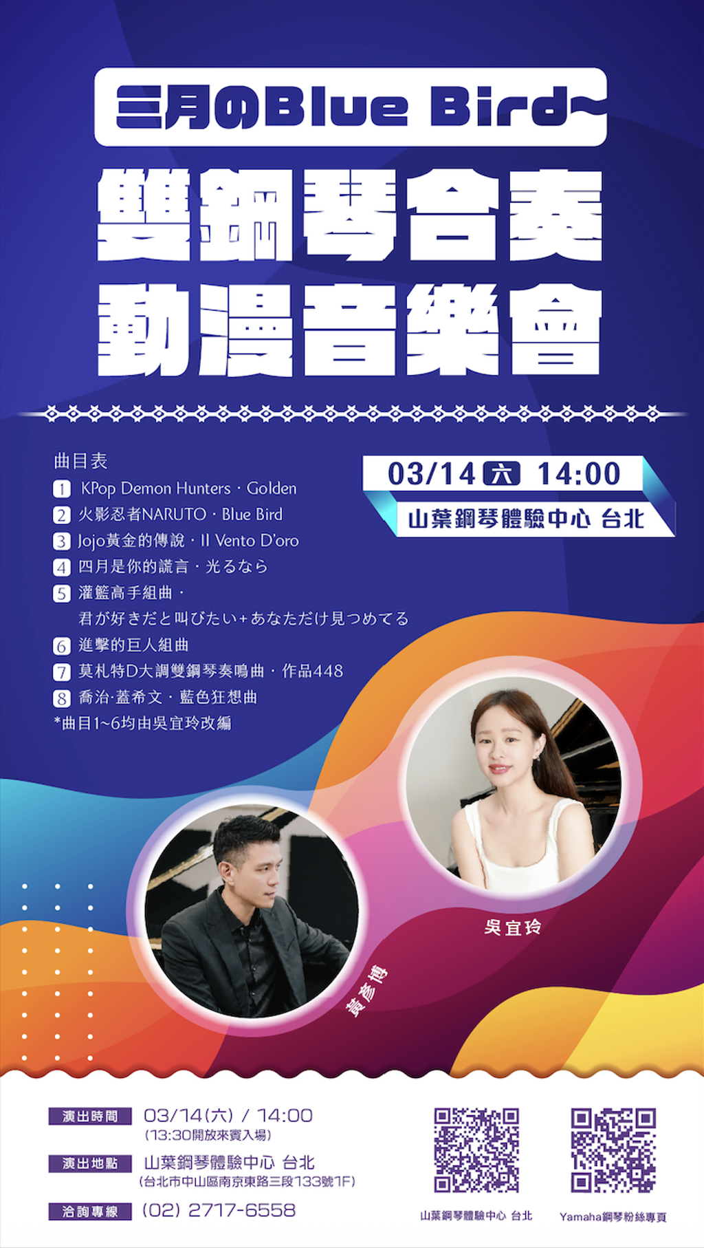 「山葉鋼琴體驗中心 台北」將於3月14日(六)舉辦月度粉絲音樂會,邀請鋼琴家吳宜玲老師 & 黃彥博蒞臨,同時彈奏原聲鋼琴與數位鋼琴,並將時下熱門動漫主題曲重新編排,帶給粉絲震撼的聽覺享受。 【曲目】 1. KPop Demon Hunters.Golden 2. 火影忍者NARUTO.Blue Bi...