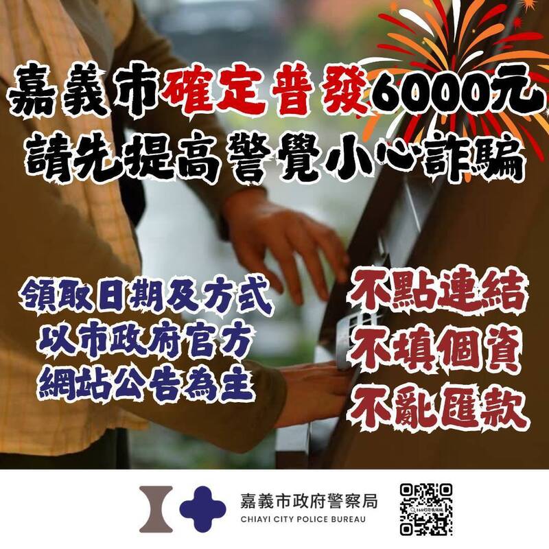 嘉義市加碼普發6千元現金今天上午經議會臨時會三讀審議通過。針對普發現金,嘉市警局提醒市民,相關發放作業細節仍需時間準備,目前市府尚未開放任何登記或預約系統,呼籲市民切勿輕信網路謠言或不明連結,以免遭詐騙。議會三讀通過市府提出「振興經濟『強化民眾消費韌性普發現金』加碼計畫」預算16億2100萬元,及「振興經濟促進商圈及夜市活絡計畫」3千萬元、「振興經濟嘉市觀光產業補助自由行計畫」2500萬元、「振興經濟永續新生活推動計畫」354萬元及「清潔人員加班費」等共5案,合計16億8054萬元。