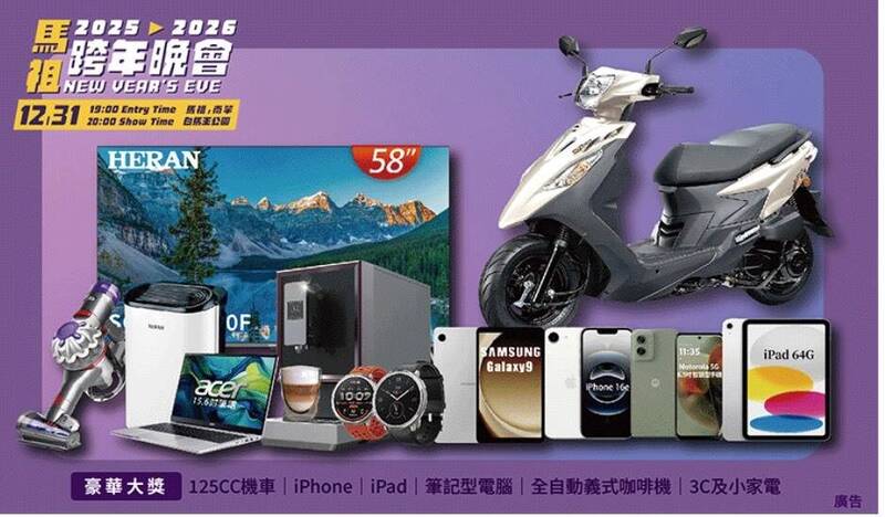 2026年馬祖跨年晚會將於下週三(31日)19時在南竿白馬王公園熱力登場,包括「情歌教父」林隆璇、音樂才女林逸欣(樂團)、以創作並演唱《練習愛情》在YouTube創下2015萬點閱數的歌手王大文,還有2025貢寮海洋音樂祭海洋獨立音樂大賞的卜星慧樂團,輪番上陣帶來精彩表演;值得一提的是連江縣政府還還準備5部機車、筆記型電腦、iPad、iPhone手機等大獎,讓鄉親、遊客幸運抽大獎,歡樂迎接2026年。活動詳情及交通接駁資訊,請上活動官網「馬祖卡蹓趣」臉書粉絲專頁。連江縣政府指出,2026年馬祖跨年晚會除了上述表演名單外,另外,將邀請獲得馬祖好聲音歌唱比賽優勝的陳思彤、陳品鈊、張雅婷、李雨秦、陳云珈等小小歌手共同與鄉親、遊客跨年迎新。